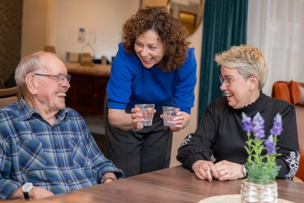 Toen Yvonne haar moeder naar Proteion De Wachtpost verhuisde, kwam ze twee middagen per week langs. Inmiddels woont haar moeder er al 4,5 jaar. Zonder dat ze het echt doorhad, werd Yvonne steeds vaker onderdeel van de huiskamer. “Als ik mijn moeder drinken geef, doe ik dat automatisch voor de mensen die bij haar zitten”, vertelt ze. In de huiskamer ontstaan vanzelf gezellige gesprekken. Voor Yvonne voelt het niet als officieel vrijwilligerswerk, maar gewoon als er zijn.
